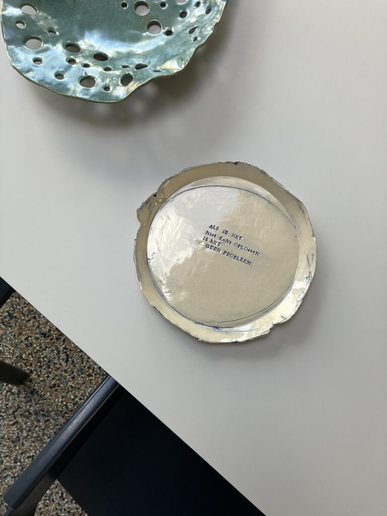 Steengoed, licht grijzige klei, onderglazuur en hoogglans transparant, 22cm. 40 euro