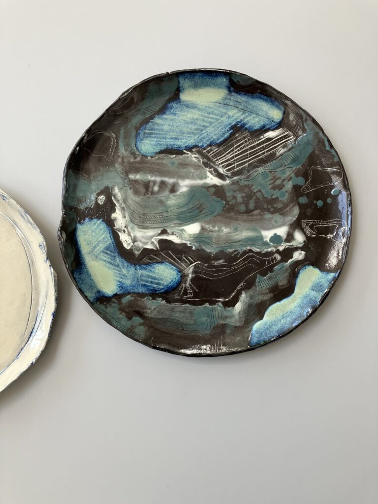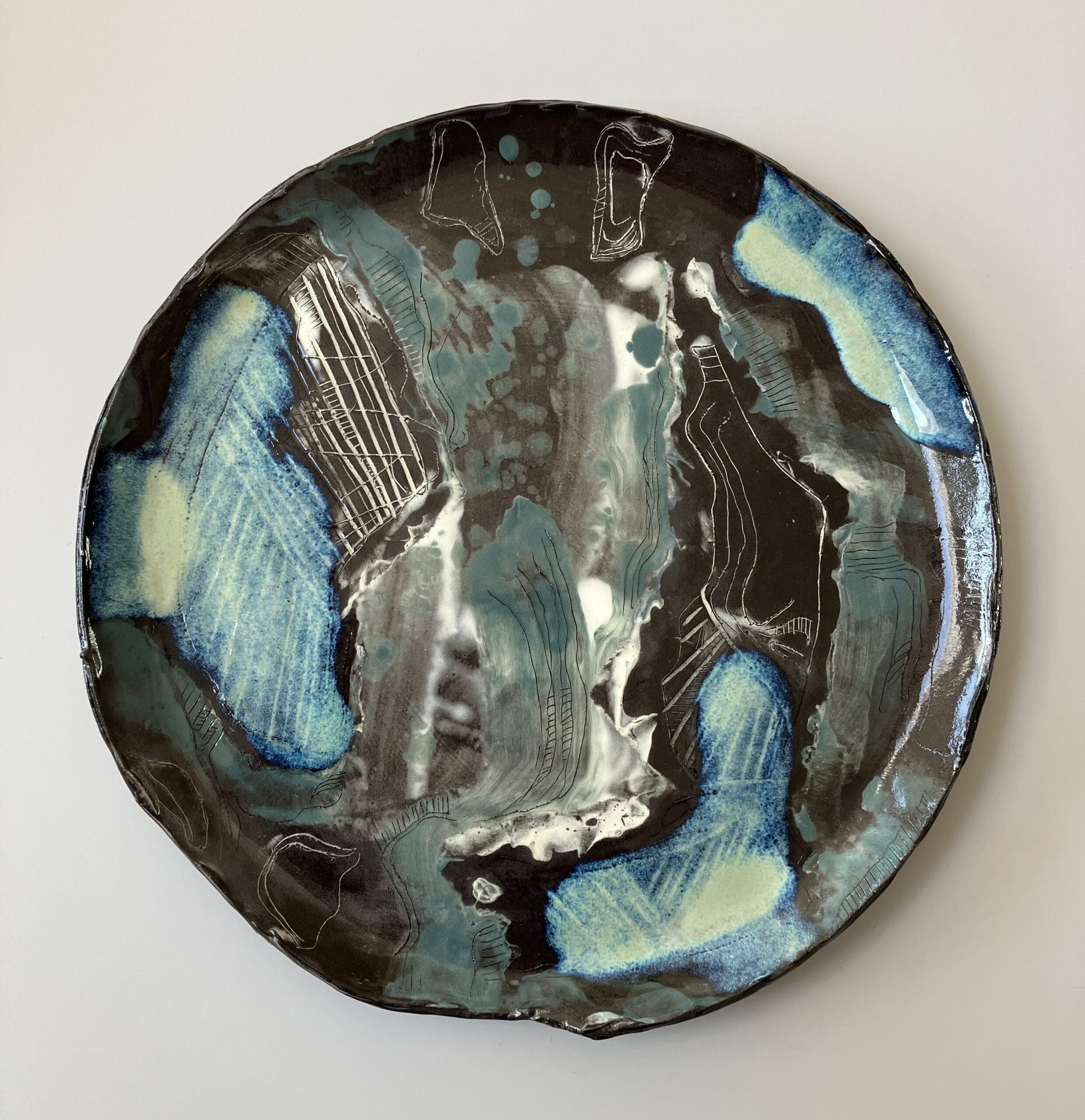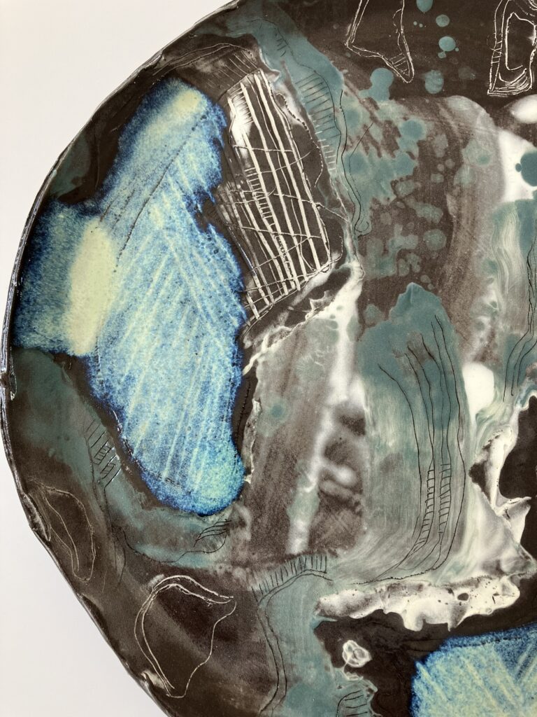 Steengoed, zwarte klei, engobes en glazuur, 29 cm