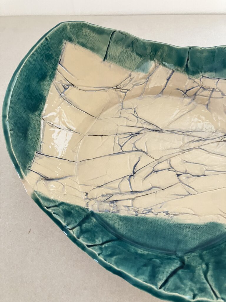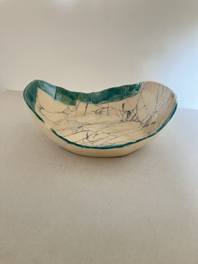 Aardewerk, verschillende glazuren, grote schaal voor fruit of chips? 28x25x10 cm — 70 euro