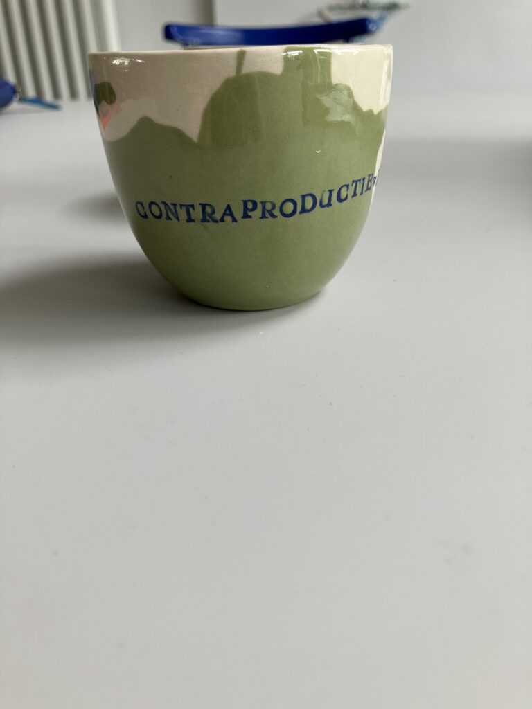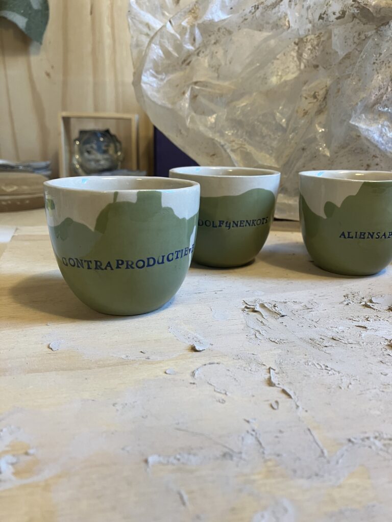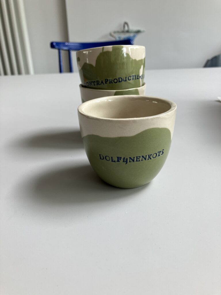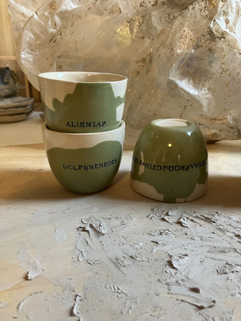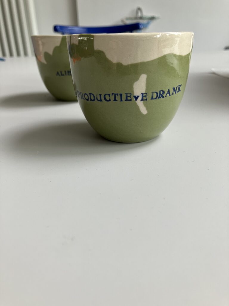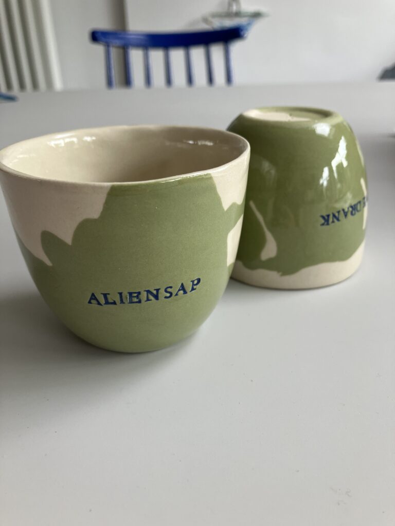Steengoed, groen en wit steengoedgietklei, koffiekopje 6,5 cm hoog 7,5 cm diameter — 18 euro per stuk