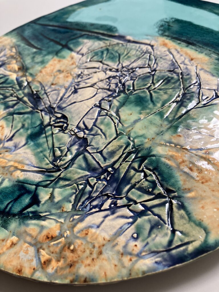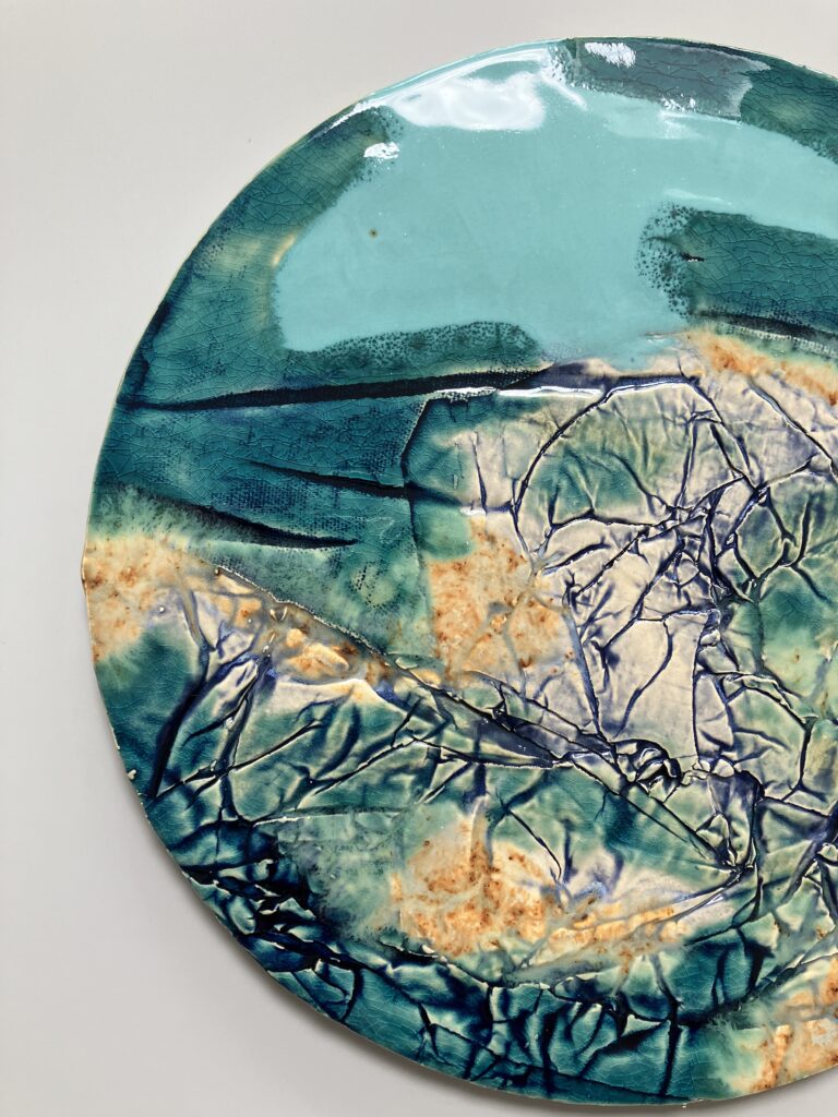 Aardewerk, engobe en verschillende glazuren, voor aan de muur, ca. 25,5 cm — 150 euro